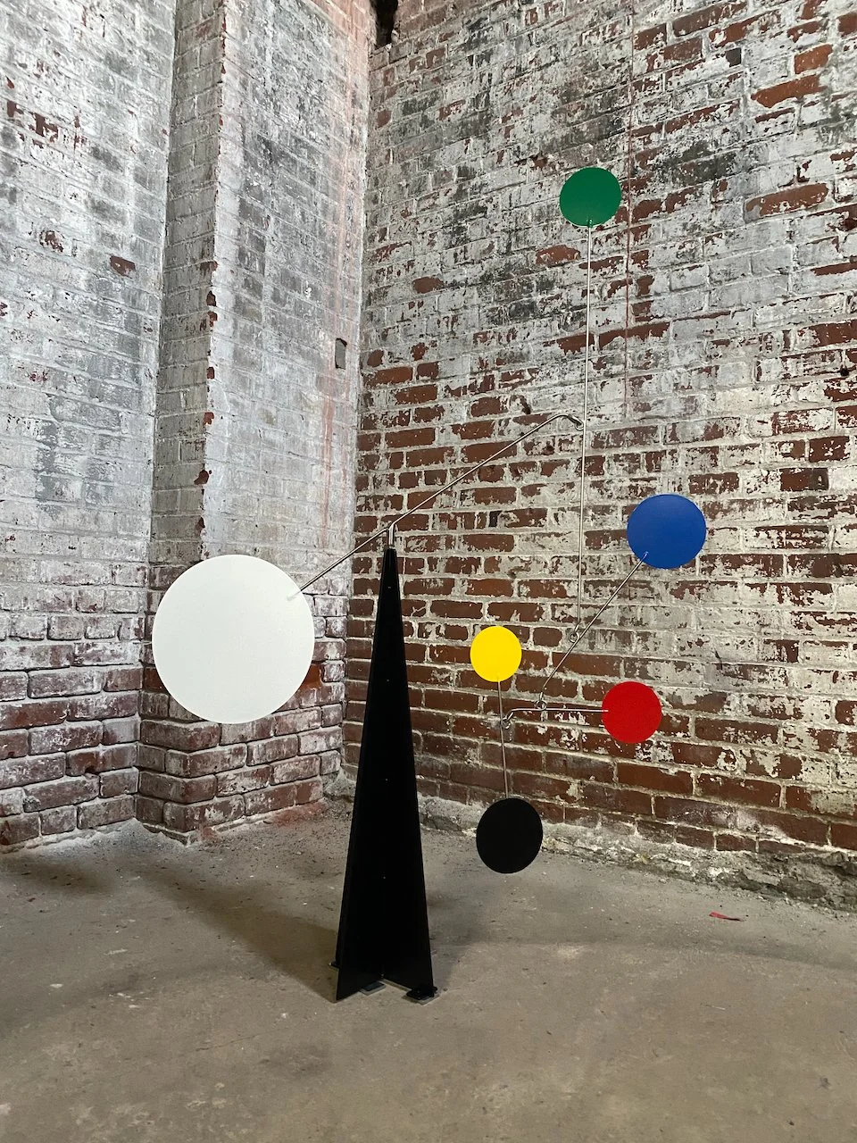 We just sent this Standing Circles Mobile to a private residence in North Carolina. It stands 4.5 feet tall with a 3-foot rotational sweep. It’s pictured here in a dingy corner of our shop, but it will reside outdoors at the front entrance to our client’s home. We love the challenge of building outdoor sculptures—we need to beef up the components to withstand the elements without making them look too beefy. We think it worked out nicely!